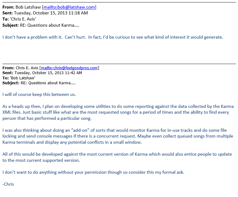 Anything else you want to debate or grief me about? Yes, in fact, there is. You can't seem to make a comment without something about it not making sense, and this last one is no exception. 1. You say you were already working on this app "before" you suggested it to Bob. That makes no sense at all. Who would start work on an app add-on and then suggest it to the app creator, which in turn would make all of that work for nothing? Not that this matters or has anything to do with the discussion, but its just one more thing that doesn't add up. The timeline doesn't have to make sense to you. However, I will note this, in reviewing other emails with Bob, I stumbled on one from October of 2013 where I asked him "Will there be any multi-venue support added? (as in keeping singers and song history for different venues independent of each other)". I suppose that question could also be counted as a suggestion. In a follow-up email, I let Bob know I was going to be working on some reporting utilities. I even called it an "'add-on' of sorts". Unlike your response, Bob was keen to the idea. (unless you are Bob and you simply forgot in which case I suggest you go back and look at our email conversations). (note - the *this* in the first line of my email refers to content in a previous response from Bob. Again, respectful of private conversations) Attachment: