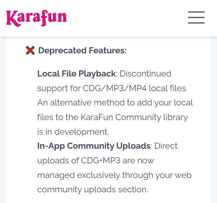 Lonman wrote: DannyG2006 wrote: They are referring to using the pro subscription only. Just saying. No other software has to make a differential between pro and amateur use because they don't offer any home subscriptions. They don't have the right to block you if you don't use the subscription to play outside files in a professional environment. Karafun is supposedly discontinuing local file support soon requiring if you want to use your own music, it will need to be uploaded to cloud storage - ie community Attachment: karafun screen.jpg Then I guess there's another reason why I don't use Karafun. I refuse to share my library with anyone else.
