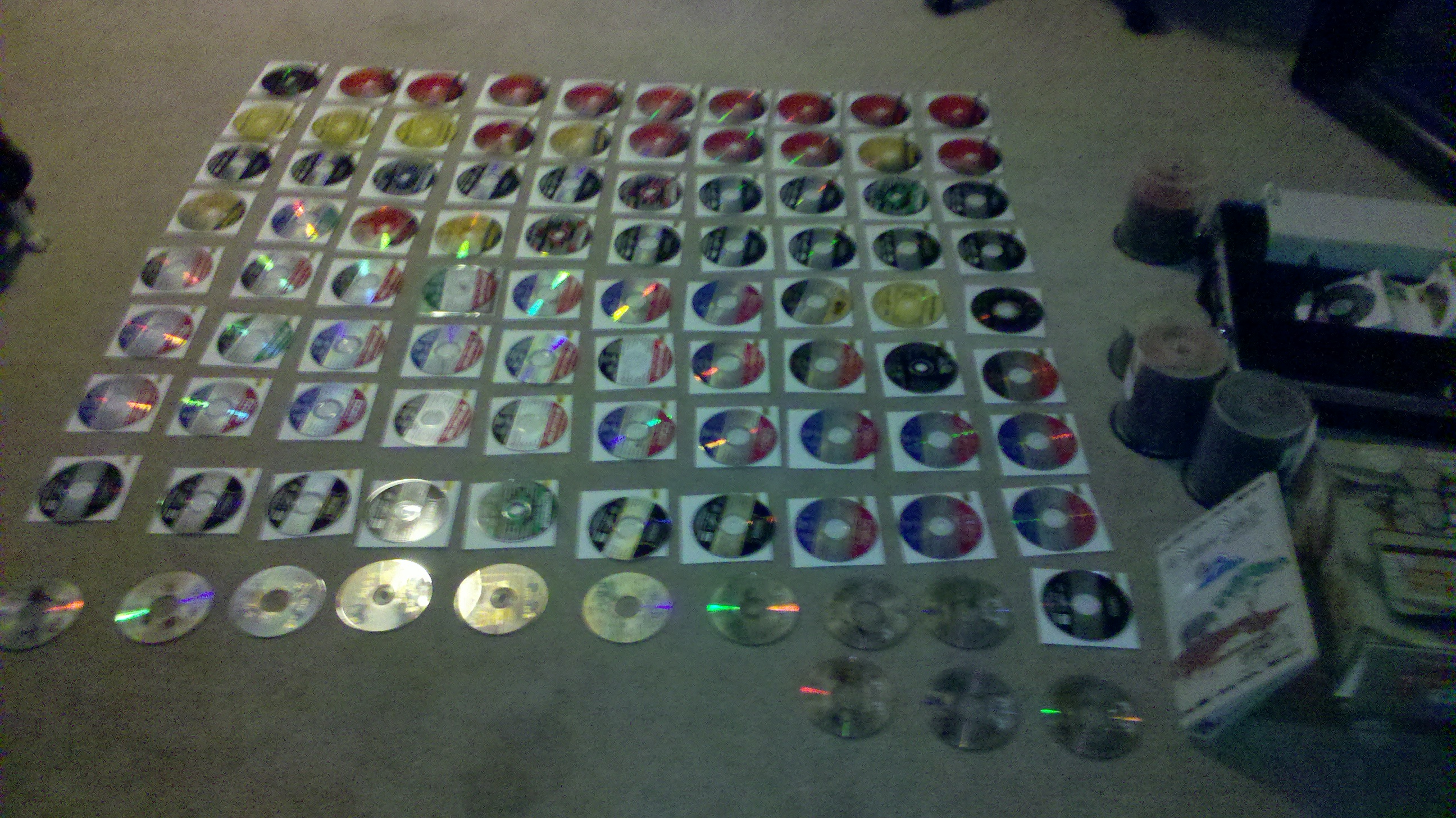 My library isn't huge by anymeans (approx 650+ discs and just over 10,000 tracks mostly CB), but considering I managed to put this together in little over a years time I'm pleased with it. The discs spread out are my SC's. The far right row is my SC Party Pack 2. Attachment: