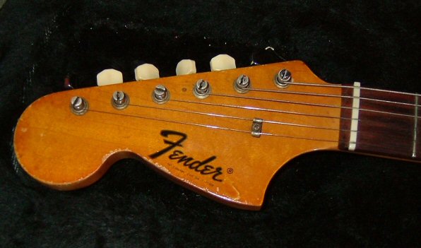 It's a lefty '68 Fender Mustang. I've altered it greatly as you can tell, but I've had several guitars, but none has had the versatility and sound that this little guitar has. I bought it for $75 22 years ago... ouch.... That one hurt.