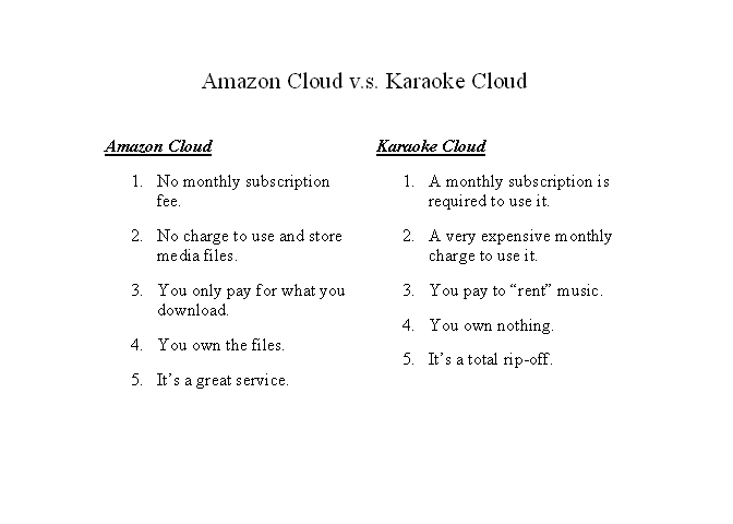 As I have said before, unless they follow Amazon's lead, the karaoke cloud is doomed to fail. We as KJ's, do NOT need it. We can do just fine without it. And we'll always be able to purchase new music from someone else, just like we've been doing all along.