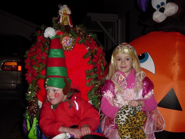 Here is a pic from Sky at Halloween... it was her first year actually "trick or treating".... she has only ever dressed up and gave OUT candy before:) We went with a friend (her son is there, he is Sky's age, has cerebral palsy) Sky was dressed as "Barbie, the Dancing Princess" (Sooooo not MY idea!)