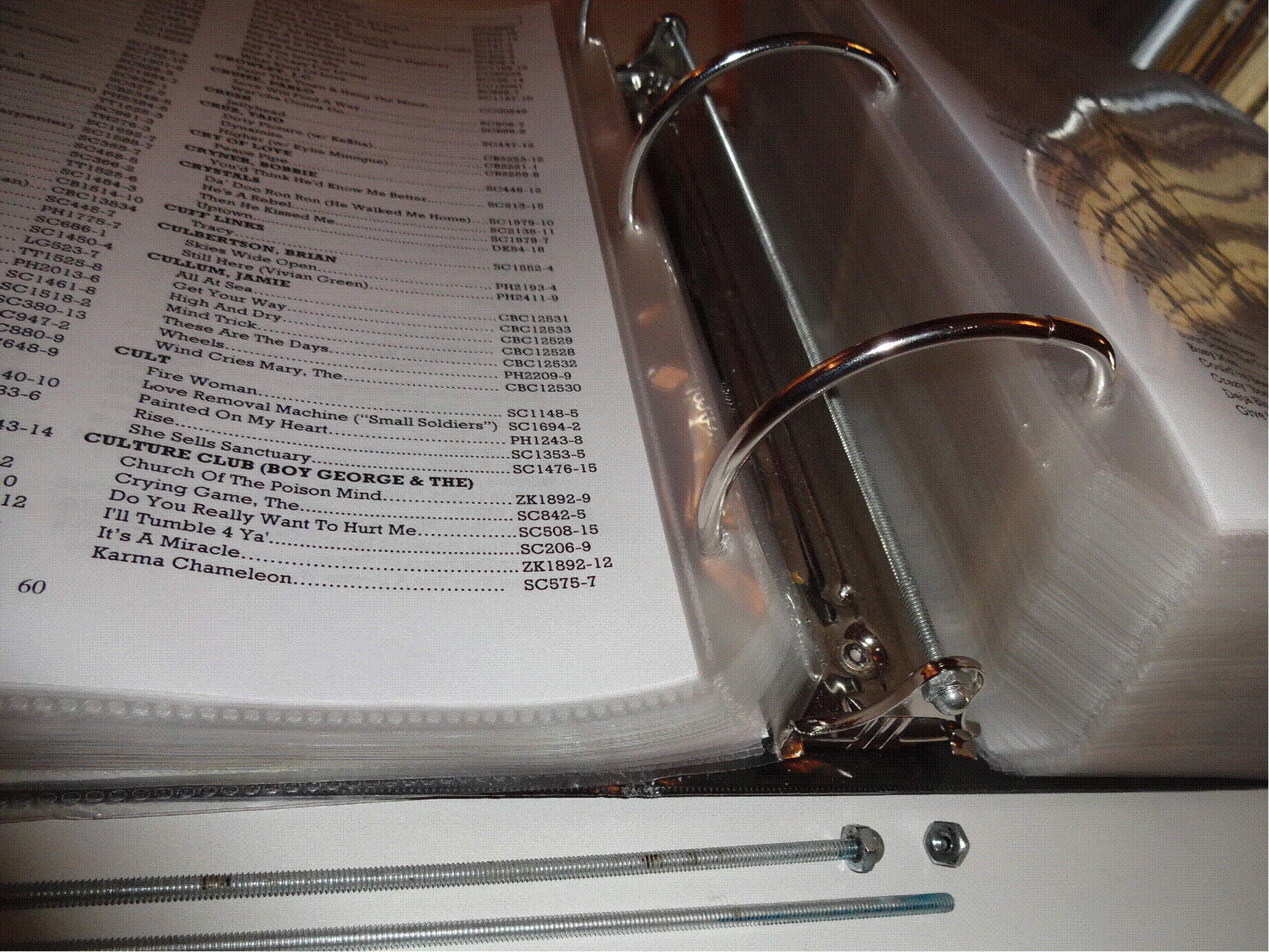 Brian A wrote: Non-reinforced heavy books will not withstand the rigors of nightly handling in a bar environment. Pages coming out of place or falls out all time? Here’s my solution. Easy does it! Drill a hole in both the center of the release ends, insert small metal rod cut to size & secure it with caps tightened with a pair of pliers (no slack, tight enough that the release tabs doesn't move backward or forward). Avail @ home depot. Less than $10 for my 10 books. The rod will prevent the books from unnecessary opening. Want to add more pages for new songs? No problem. No need to detach the rod. With two fingers, the ring(s) will open up with just little space gap enough to insert plastic sheets. The opening of pages will function normally as the rods are in the middle & will be not be in the way. I completely update my books twice a year to incorporate new released songs. That’s when I remove the rods. Attachment: Binders.gif Brian......*THIS* is precisely the kind of thing I expected when I came to these forums. Absolutely fantastic, creative problem solving. I may just change my books completely now after this post. Thank you! -Chris