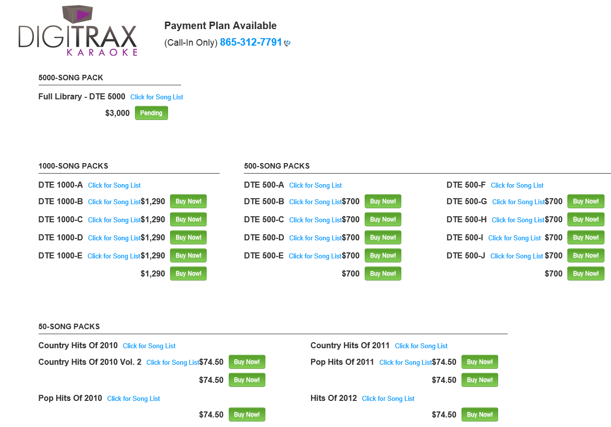 Want to have a completely legal karaoke library, with no worries and no hassles? We can help you find a solution that fits your needs and your budget, and lets you sleep nights.Shouldn't read "I would like to verify I am legal by your standards"? They make the person filling out the form feel illegal just by clicking a button. "solution that fits your needs and budget" - Be prepared for a sales pitch with an underlying tone of "if you want to be legal, here are some of your options...." KaraokeCloud sells the following disc packs - DK - 341 tracks - $500 Stage Stars - 338 tracks - $500 SBI - a broad variety of packages ranging from $700 - $3800 Sunfly - a broad variety of packages ranging from $700 - $2000 Too much to type for the Digitrax options so here is a screen shot - Attachment: