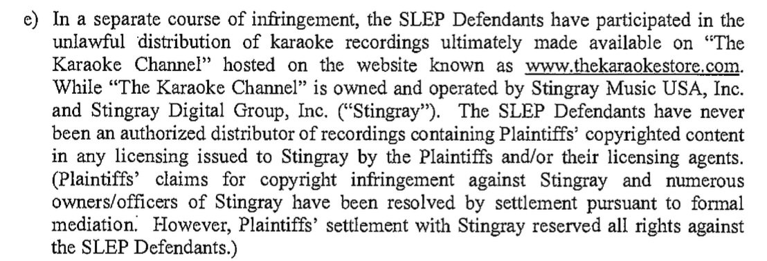 KSFGROUP wrote: When Sony sued Slep-Tone, they also included Stingray. They agreed to a settlement early and were removed from the suit while Slep-Tone continued. It's all about MONEY. This is not accurate. If Sony sued Stingray, it was not part of the same suit when Sony sued Slep-Tone. (Technically, it was EMI, which is now a unit of Sony, although Sony filed its own suit later. Regardless, Stingray was not involved in either suit.) EMI sued a completely unrelated company, KTS Karaoke, along with Slep-Tone. KTS's insurance company settled with EMI (over KTS's objection, which EMI got around by waiving any injunctive relief--thereby proving the last four words quoted above).