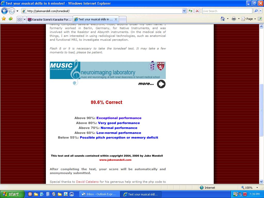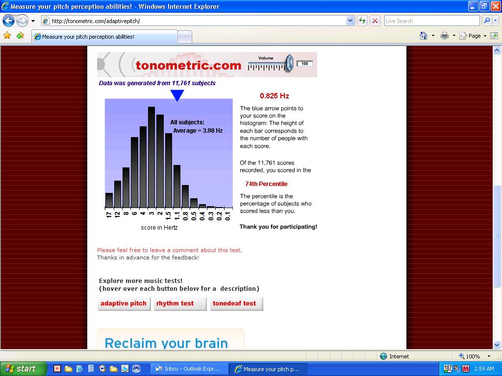 I got an 83 percent on the tone-deaf test. The other two were too depressing to post.