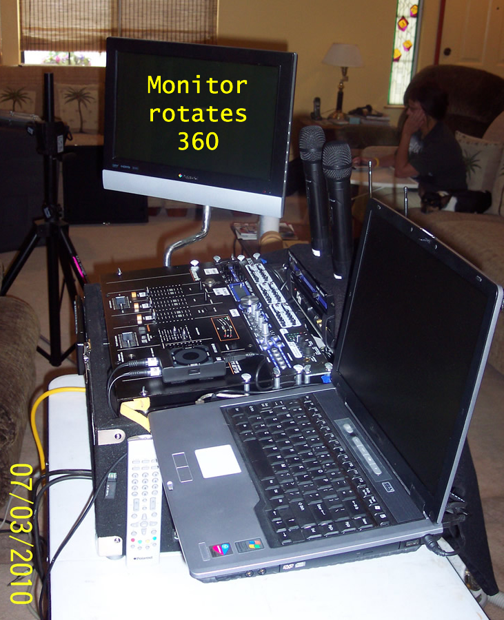 Being new to this gig, I have an issue with a question. I’ve notice that sometimes I have to set up my 19” flat screen on a stand way over there, where I can’t see it, and there are no other monitors in-house for me to monitor what’s going on. While I can play the software karaoke player on my PC screen (small pop-up and in the corner of the screen), when I play a CD or DVD through my stand alone player, that image only plays to the monitor and there’s no input on a laptop to send that players image to the PC screen. I made up a little bracket so I can mount a 15” monitor to my enclosure, and it works pretty well. What fixes for this have your pros come up with?
