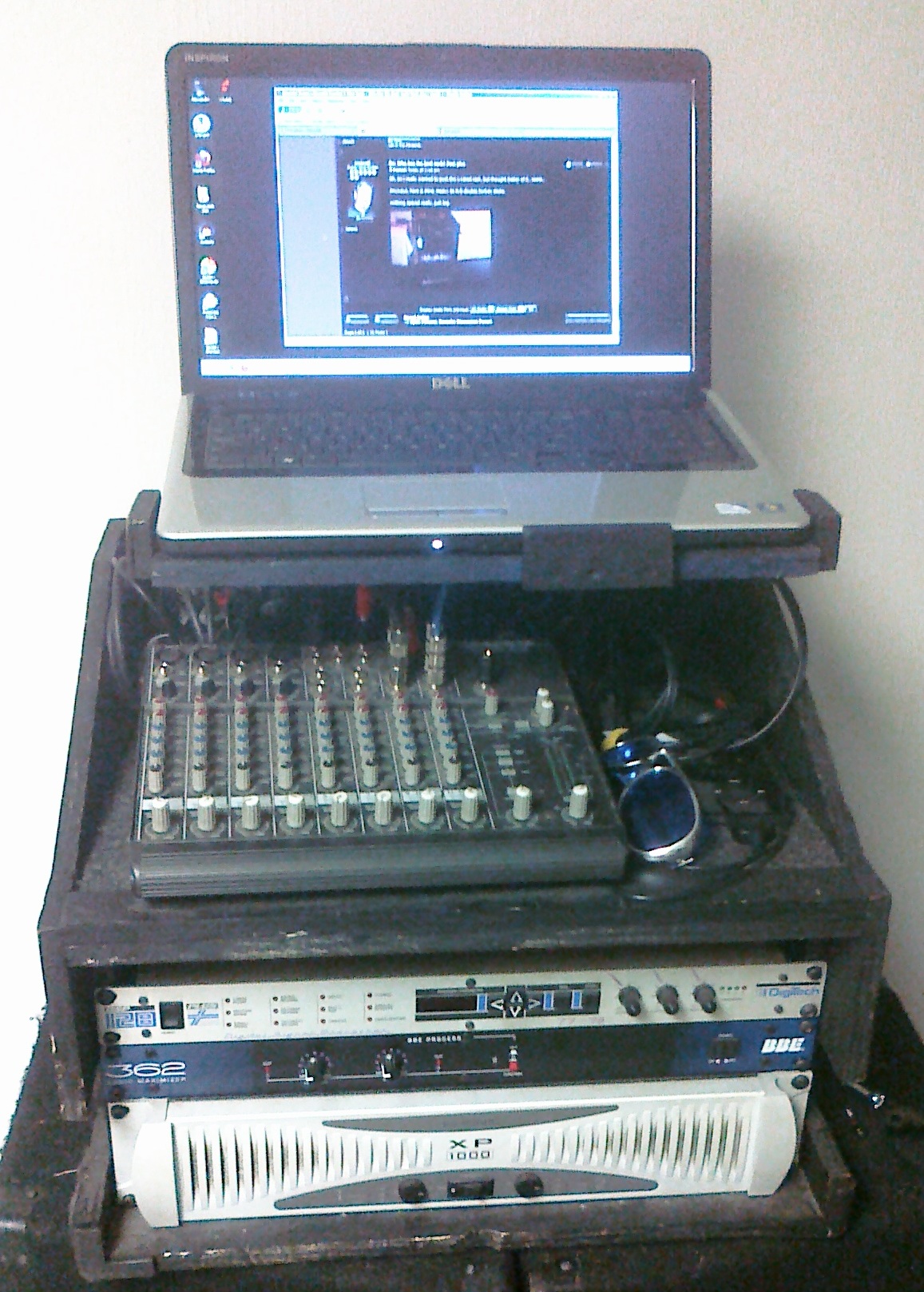 Rack contains my Mackie VLZ mixer, a USB hub, Berringer USB audio interface, 30gb iPod (used for fill/voiceover music), Digitech DSP effects, BBE Sonic Maximizer, and a Phonic XP amp I picked up recently that powers a pair of Yamaha BR15's nicely.
