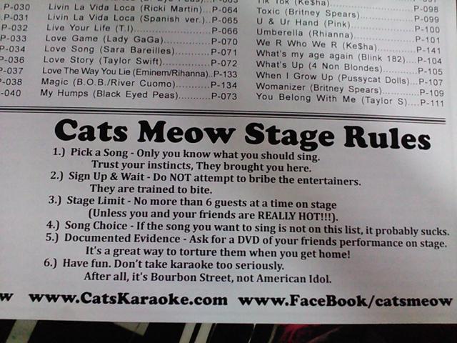 That's Cat's Meow on Burbon Street, correct? I've been there, and it is a very good karaoke bar. When you have a touristy town coupled with drunk 20 somethings practically begging for a good time, coupled with 200 upbeat or classic songs, everyone wins! This is not the type of place that has regulars, it is all tourists, so 200 carefully selected songs is plenty!