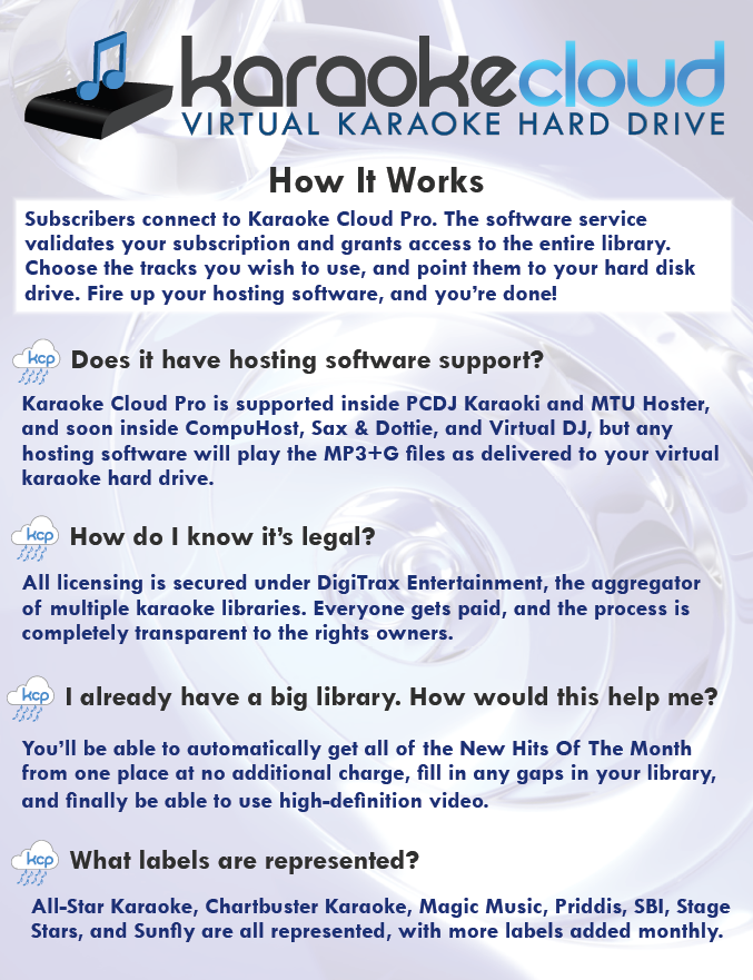 KaraokeIan wrote: Wow, look at all the hosting software that got in bed with this music renting concept. Amazing. Not that amazing and there's nothing special to making your hosting software work with a library that is "net-based." Here's an example if you'd like to be "your own cloud:" #1. drop a computer in your basement with all your songs on it - call it "drive X" just for fun. #2. change your NAT settings on your home router so that all "incoming requests" are pointed to that machine. #3. install a program called "NetDrive" on your hosting machine (really cheap) It will trick your hosting machine into thinking that drive "x" is really a hard drive on your hosting machine. It uses an ftp connection to your library machine. That's basically it... Now, when you want to run karaoke at your club and have an internet connection, start NetDrive first - which will connect via ftp to the "library" at home, then your hosting software. When your hosting software needs a song, it looks to drive "x" and NetDrive goes out on the net and gets the file. Your hosting software doesn't know the difference and if you have a good internet connection, most patrons will never know the difference either. Now, if you want to make it "a cloud"... you simple "sell access" to the library machine and since it requires an ftp connection, you can add (or kill) any account as the administrator.... Someone doesn't pay their "access fee?" Suspend their account by simply changing their password until they pay up.... (Note: this is "not really kosher" to set up this way, but it illustrates how easy it is to do. ) It's not "streaming," but rather "file serving" and you can use the hosting software you already have.... Insta-cloud.....