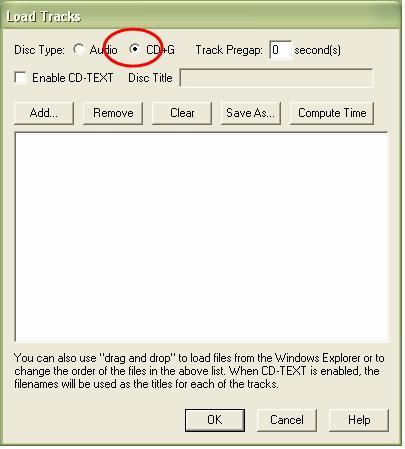 When you open up CDRwin, click on LOAD TRACKS. That will take you to the load tracks window. BE SURE THAT THE CDG OPTION AT THE TOP OF THE SCREEN IS CLICKED!!!! Please see the picture that I have attached. That should help. This is a very important step.