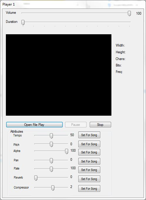 Player 1 is for the KJ or home singer. It has all the controls on the main screen. Note that songs can be started, stopped,paused or volume adjusted from either the main window or the player window. You can also scroll back in a song if a singer didn't start on time and you don't want to start over. Note that you can store settings for each song if you like and set defaults in the options area. I am working in this area right now. If you do not have a compressor set for a song, it will go to the default. You can change on the fly and it will reset to the default on the next track, unless the song has it's own settings stored, then it will go to those settings.