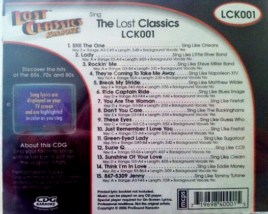 Brian A wrote: I agree with Lon. $30 each is overpriced for mediocre cds. Heck, I believe I only paid $18 ea new from way way back years ago.  Try this one - if you win this set 1-9 (sealed/new according to the seller) cost to you would only be $30 w/ shipping. Even if you pay over $50, still better than the lady offering you 8cds @$30 ea = $240. Good luck! http://www.ebay.com/itm/Lost-Classics-K ... 3a8543fbf8fyi – item no longer available. I bought it. I just received an invite from a dear friend having a karaoke birthday party at her home in 3wks & I don’t know what to give her. She doesn’t have a lot of cds, so this will be a good addition & definitely in line with her collections of mm, sav, tt & dg. It was up for auction listed for $30 (ship incl.), less than a day left & no bid. I emailed the seller if he’s willing to do “buy it now” option with my offer of $40. He agreed, sent me a paypal invoice, done deal. I also asked the seller if the cds are legit. He assured me they are. His teen daughter received these as part of prizes for winning a regional karaoke contest sponsored by karaoke stores in the area. Daughter doesn’t recognize the songs, hence - - Sold! Not bad, 9 new cds for $4.45 each. Yaaay!
