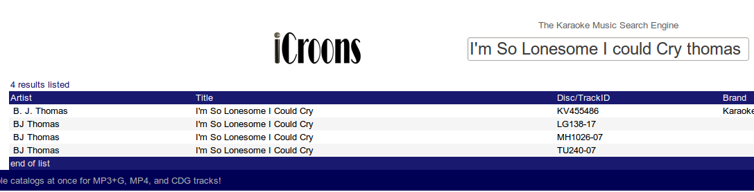 As for iCroons, I thought someone posted that they only offer music without the lyrics. Was that incorrect? icroons does not offer music, just listings of what was released on disc or download, like the old KJPRO database online, but also includes download sources so you can order custom discs if you want to which KJPRO and SBD does not do.