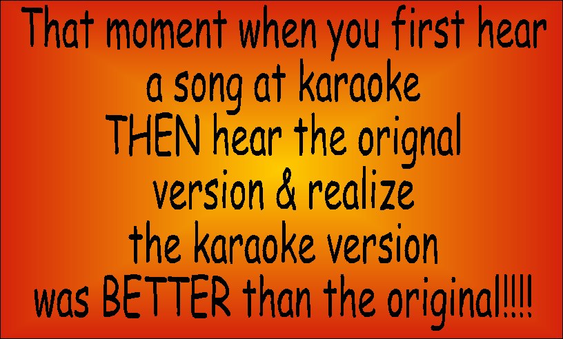 ?? Huh? I believe he's talking about only hearing songs at karaoke and liking them there first, THEN hearing the original song & realize you like hearing the karaoke people sing it better because the original singer doesn't do it as much justice.