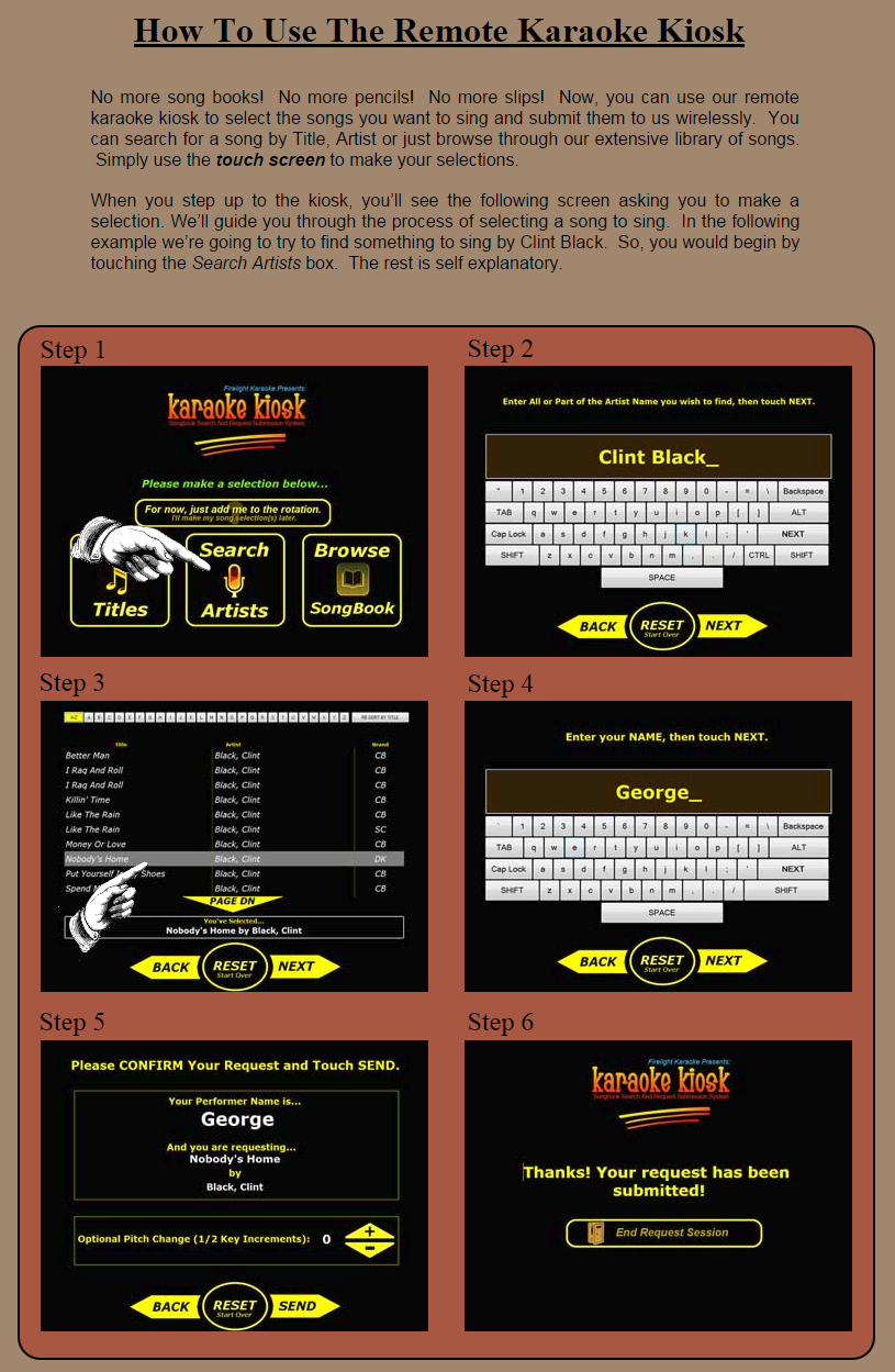 IPad 1st gen needs to be jailbroken to use encarcerator app to lock app for kiosk mode. Yeah, that sounds a lot better then using that Songbook DB. Why would anyone want to continuously pay a monthly charge to use it (DB) when there are better alternatives. What you will have paid in about 3 months buys you better software, with no adds, no internet needed, and you own it. But, to each his own. and that software would be..... Yeah, as I heard the remarks about 'more professional'... etc.. I had to wonder, "What software are you talking about?" Why would someone say something like that and then not give actual details? No internet connection? Really? So, your singers are using their phones how? There's a network connection SOMEWHERE. 21" touch screen? Must be nice to have all that room. See.. the way this forum is suppose to work is we share our ideas with one another. I use the Karaoke Kiosk Remote Request System. You have to be using CompuHost software. If you are, it integrates beautifully. And no, you don't need an internet connection. You DO need to set up a network using a wireless router for customers to be able to view, search and remotely send their requests using their smart phones. Of course, using the kiosk itself does not require anything on the users part except to walk up to the screen and do your thing. Once the customer sends their request, either by phone or kiosk, it is entered under the name in the rotation. It happens within seconds after the customer hits send. You need to nothing else. They send it, you get it. Done! I have pictures on my website showing screens of the kiosk and smart Phone that I've posted below. Click on the picture, then click again to see it full size. I didn't want to mention what software I use because many of you think that I'm a CH fanboy. But the truth is, CompuHost along with their song book creator, FastTracks and the Remote Kiosk, all integrate and perform beautifully. It is the complete package and the most comprehensive, professional software I've ever used in my hosting career. And now, KJ media pro is back which allows you to purchase credits used to unlock songs instantly whenever someone requests a song you don't have. Again, no internet is required (except for initially storing locked tracks on your hard drive). So, yes IMO CH is the best and blows away Songbook DB. But again, that's just my professional opinion. Just want to clarify once more: You do NOT need an internet connection with the software and system I described above. People connect to your network, NOT the internet. If they're not using a Smart Phone, they don't have to be connected to anything, to use the Kiosk which is already connected to your network. Just wanted to make this totally clear... No internet connection is required. which is a good thing, you know why?? Because so many places have such a bad signal making it very frustrating to run shows that rely on a stable internet connection. One place I'm working in the signal is so bad if I want to use my phone to make a call or go online, I have to walk to the street. It is recommended that your laptop be used to run your show without NO internet connection and NO virus program running. Anyway, the point is you DON'T want to rely on the internet to run your show. Good Luck. One more thing... I do not work for or have any interest in CompuHost. What I do have, is over 17 years experience hosting karaoke. During that time, I've tried and used just about every hosting software there is and have found none of them equals or even comes close to the power of CompuHost. Many will disagree and that's OK. And that's why I didn't want to mention it because it usually opens up a debate of which I didn't want to start. Bottom line is, everyone will have their own opinion. Use what's right for you.