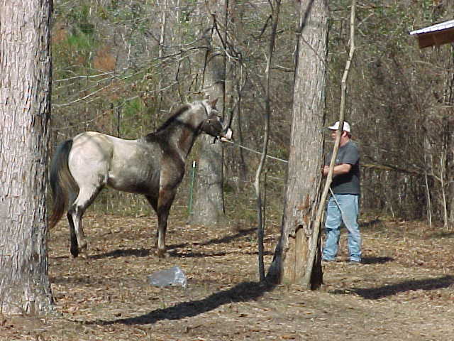 He came up to my cuz cactusjack a few weeks ago when he was visiting...He made the dangest faces and mouthed all over cuz...That was cause we had the fence between us and the horse felt comfortable..But you get that sucker in the pen and he goes full tilt wild pony-"don't you even get close or i'll kick yer head off" kinda