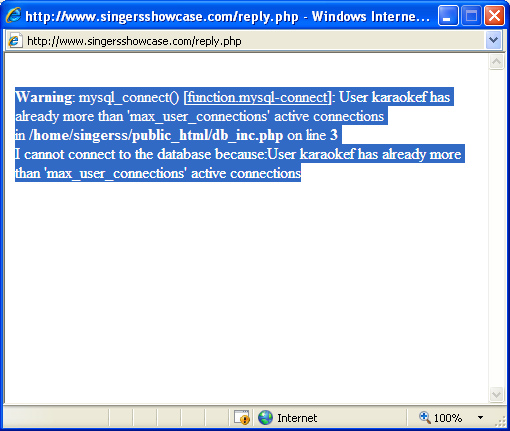 Warning: mysql_connect() [function.mysql-connect]: User karaokef has already more than 'max_user_connections' active connections in /home/singerss/public_html/db_inc.php on line 3 I cannot connect to the database because:User karaokef has already more than 'max_user_connections' active connections