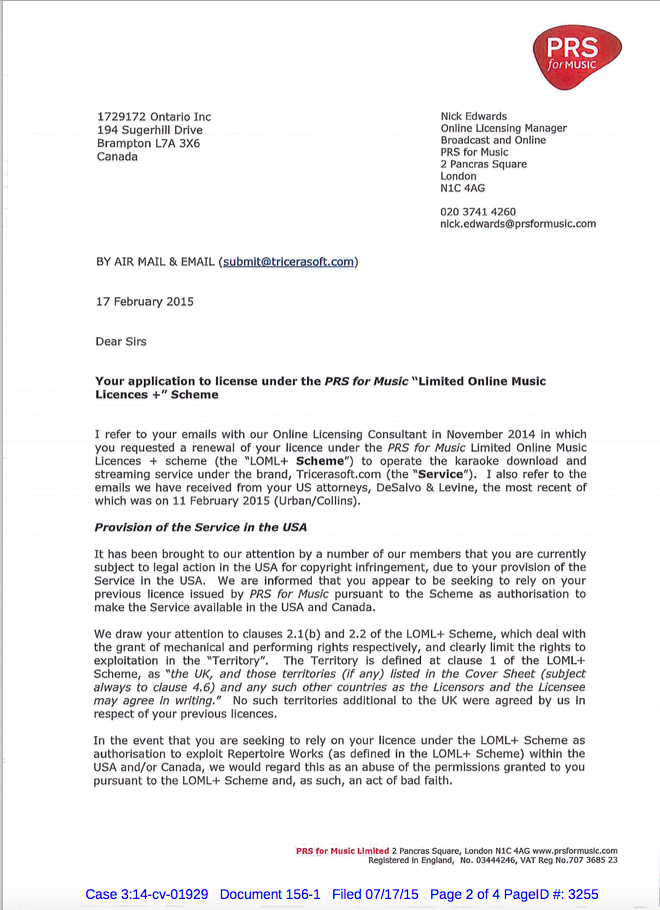 This really shouldn't be that much of a surprise to be fair. PRS licensing scheme makes production of content cheap and simple to do. But it is no different than any other with respect to territory. It seems like a popular misconception here that the sale of content by UK manufacturers is completely legal for anyone who wants to buy it regardless of where they live. This is absolutely not the case. In this attached letter which is publicly available from the ongoing suit between Sony/EMI and Tricerasoft, the PRS is explicitly clear that under no circumstance are UK licensees allowed to sell outside their territory. Zoom is no different than any of them in the UK...they won't do anything to hinder customers outside their approved territory unless they are actually forced to. It is what happened to Selectatrack and their motivation to partner with Tricerasoft in creating the Selectkaraoke "skin" of Tricerasoft and their being named in the ongoing suit as well. Attachment: