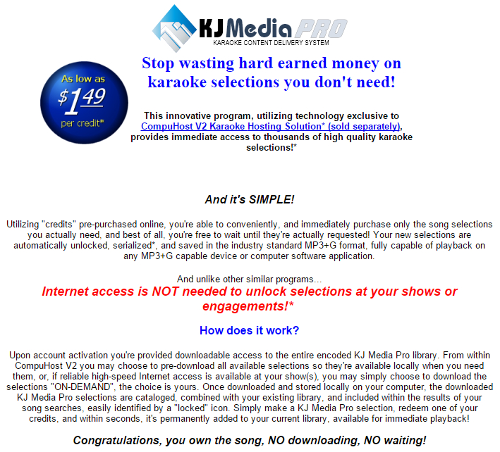 Why aren't the labels jumping on the new format technology? they know its there but fail to implement it. Example 1) KaraokeCloudPro downloads all the songs to your PC in .dat encrypted and works only with the software it downloads to, and also works in an offline environment. That's what CompuHost offers. It will download tracks from Karaoke Cloud that you unlock with credits that you purchase from CompuHost. You only need an internet connection when your downloading/storing tracks to your PC. It works great. Once you unlock a song, a serial number is put on the opening screen like "KJ Media Pro: 123456". Hopefully this proves that we unlocked, paid for, and own the selected track. Here's the info from their website, click on the picture below: