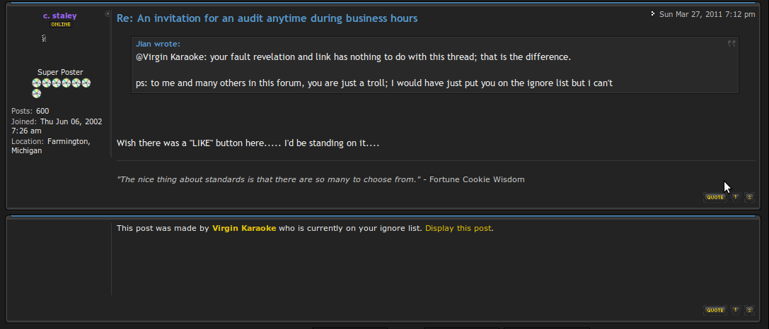 ps: to me and many others in this forum, you are just a troll; I would have just put you on the ignore list but i can't Actually it was in direct response to your post on this thread! What I do has nothing to do with trolling, unless you want to call the truth trolling!