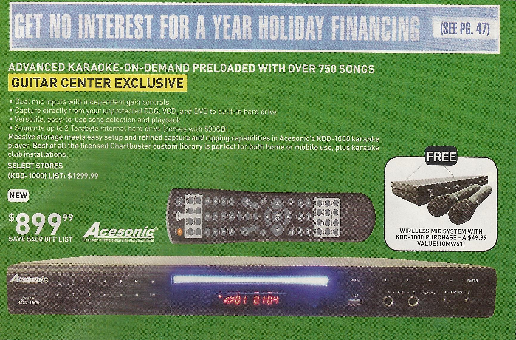 "massive storage meets easy setup and refined capture and ripping capabilities in Acesonics KOD-1000 karaoke player. Best of all the licensed Chartbuster custom library is perfect for both home or mobile use, plus karaoke club installations."
