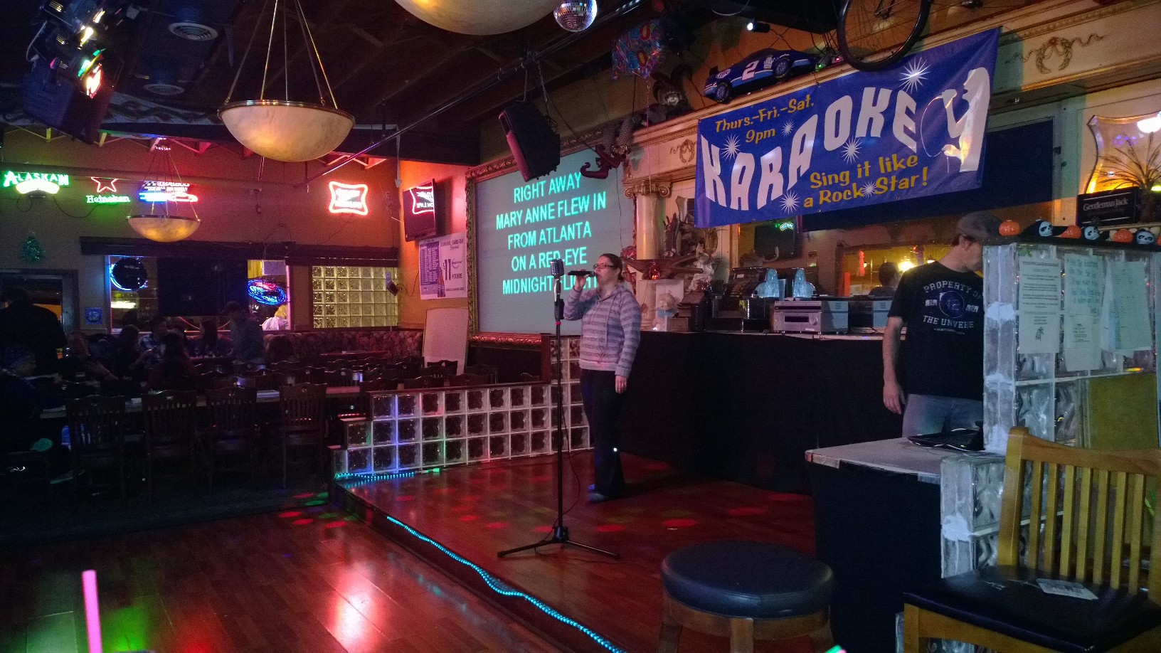 NoShameKaraoke wrote: Where are the singers looking for the lyrics? I like that you have the big projection behind them so the bar can follow along, though. In the panorama pic, just left of center you will see a 42" TV on the wall. I do wireless HDMI to that screen for singer lyrics. This isn't a super fancy venue, but it is a large venue. I was told they had there best Thursday in 6 months last night. For that I credit my wife who has been doing 90% of our marketing for almost a year now. She has done a fantastic job of keeping our name in front of the karaoke community, creating fun, engaging social media marketing, and putting up with the monstrous amount of time that karaoke has consumed in the past few months. I just might have to put her on the payroll.  -Chris