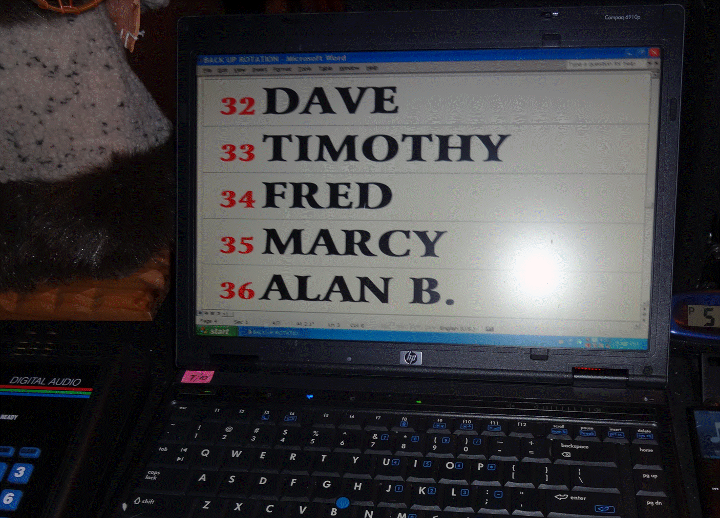 Alan B wrote: ...and have you noticed just how well CompuHost does the scroll? Yes, I know that there are a few programs that can do a scroll but none of them can do it as well as CompuHost. CompuHost does it with such power, such style, such grace. It does it beautifully and most of all, it does it with love. Karma: I don’t use the continual singer crawl feature. Been using microsoft word laptop notification method for years, type singers’ names displayed on two 25” tv’s, five names at a time, then just scroll down (a/b switch so they can't see what I’m typing). They immediately know who’s next & also gives them an approximate time for bathroom or smoke breaks before they’re up. I probably get a lot of flack for this but my singers & I find it kinda distracting to look at the song graphics with the scrolling marquee rotation going below. But that’s just me…………matter of personal preference! Scenario: Alan submitted his request slip 1½ hrs ago, I could’ve inserted his name within the rotation, but he’s such a b**thole he earned the spot at the very end! (kidding, alan)!  Attachment: