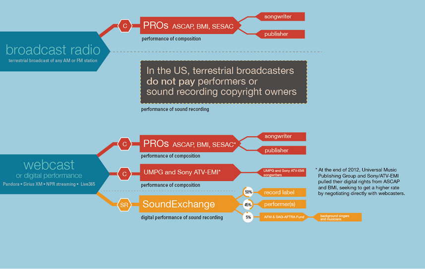 Pandora has a bit to say. http://qz.com/197344/pandora-and-the-music-industry/Under a “consent decree” issued by the Justice Department in 1941, ASCAP and the other main publishing royalty organization, BMI, which together control about 90% of all commercially available recorded music, are obliged to grant blanket licenses to anyone (mainly radio stations) requesting them. When a fee can’t be agreed, a rate-setting court decides the percentage amount of royalties these license holders pay in exchange. + This arrangement makes it logistically possible for the radio business to exist—a station effectively only needs to deal with two companies, rather than millions of artists, composers, and publishers, to get access to a vast array of music. And songwriters don’t have to spend time worrying about negotiating or policing the licenses for their work. + Unlike old-fashioned radio companies, internet-based services like Pandora are also required to pay separate performance royalties, which go to record companies, and then performing artists. In fact, this is Pandora’s single biggest cost. It paid out 49% of its revenue last year in performance royalties, compared to 4% in publishing royalties, which go to publishing companies, and eventually songwriters. Attachment: