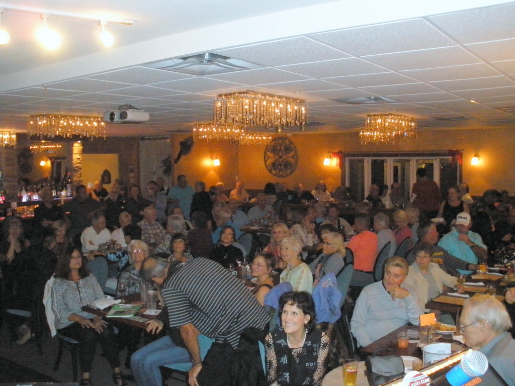 andrew3000 wrote: I use lots of creative phrasing to deal with bad singers that want feedback. "Well, there were definitely some timing issues, but it was a lot of fun!" "Great song choice, everybody loves that tune." "You just gotta project a little more and you'll be golden!" I'll never straight-up tell them they're good when they're not, but you can say anything with a smile and it sounds better. I had an "over the top" evening Wednesday night. My venue holds slightly over 100 people and the owners were collecting unused chairs from every table to be redistributed. My singers that night were 80%+ excellent singers that truly were worthy of compliments, but even those less talented were given some "creative" comments about their performance. Every singer was part of the extraordinary evening that night, and they deserved some sort of acknowledgement. Attached is a picture from that night. There were even more people than the camera shows, and if I'd used my other camera with a wider lens, it would have captured most everyone.