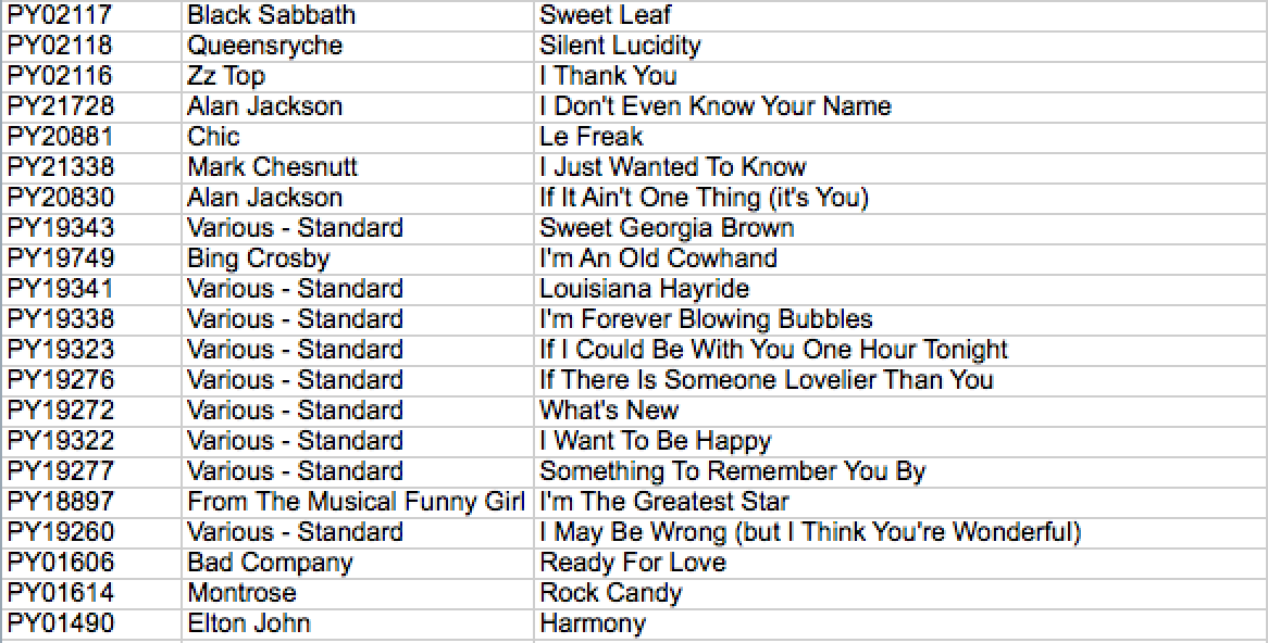 PY19890 Alabama If I Had You PY02021 Alessia Cara Here PY20601 Bette Midler The Girl Is On To You PY02018 Blue Suede Hooked On A Feeling PY21457 Boy Howdy They Don't Make 'em Like That Anymore PY22086 Bryan White So Much For Pretending PY19912 Captain & Tennille The Way I Want To Touch You PY21111 Chaka Khan Smokin' Room PY15661 Charles Johnson The Love Of Jesus PY15677 Charles Johnson The Winds Of This World Is A-blowin' Strong PY20889 Clint Black The Hard Way PY02032 Coldplay Everglow PY21991 Daryle Singletary Too Much Fun PY02022 Daya Hide Away PY01973 Elle King Ex's & Oh's PY01949 Ellie Goulding On My Mind PY01798 Fifth Harmony Ft. Kid Inc. Worth It PY02028 Fleur East Sax PY22409 Flynnville Train The One You Love PY22389 Frank Sinatra Wrap Your Troubles In Dreams PY02039 Frankie Ballard Sunshine And Whiskey PY21027 "From The Musical ""godspell""" Turn Back O Man PY02024 Hailee Steinfeld Love Myself PY02017 Hanoi Rocks Boulevard Of Broken Dreams PY20346 Heart Stranded PY15686 Heirloom There's Still Power In The Blood PY15711 Highest Praise Victory's On The Other Side PY02029 Jess Glynne Take Me Home PY02044 Jethro Tull Thick As A Brick PY02034 Joan Jett Bad Reputation PY02020 Joan Jett & The Blackhearts Do You Wanna Touch Me PY02042 Judas Priest Revolution PY01955 Justin Bieber What Do You Mean PY01988 Justin Bieber Sorry PY02026 Justin Bieber Love Yourself PY22276 K-ci & Jojo Tell Me It's Real PY02038 Keith Urban Somewhere In My Car PY22954 Kem Ft. Chrisette Michele If It's Love PY15699 Kirk Talley Tomorrow PY02040 Lee Brice Girls In Bikinis PY01792 Major Lazer Ft. M㸠Lean On PY15687 Margo Smith & Holly They See My Daddy In Me PY01899 Meghan Trainor Ft. John Legend Like I'm Gonna Lose You PY15696 Mullins Till Kingdom Come PY15671 New Journey The One Who Knows PY02030 Nicki Minaj The Night Is Still Young PY02025 One Direction Love You Goodbye PY01929 Paul Revere And The Raiders Kicks PY15684 Perfect Heart There's A King On The Way PY02035 Pink Floyd Brain Damage PY01948 R City & Adam Levine Locked Away PY22567 R. Kelly Christmas I'll Be Steppin' PY02043 Rage Against The Machine How I Could Just Kill A Man PY19744 Reba Mcentire Today All Over Again PY21504 Richard Marx The Way She Loves Me PY02037 Rush Subdivisions PY02023 Sam Smith Lay Me Down PY02036 Sammy Hagar There's Only One Way To Rock PY01951 Selena Gomez Same Old Love PY01946 Selena Gomez & A$ap Rocky Good For You PY02031 Silento_ Watch Me (whip Nae Nae) PY01956 Taylor Swift Wildest Dreams PY01918 The Byrds All I Really Want To Do PY15519 The Cathedrals Jesus Saves PY15622 The Cathedrals Step Into The Water PY15624 The Cathedrals Still Drinking Water From The Well PY19966 The Four Tops Walk Away Renee PY01921 The Hardtimes Fortune Teller PY15708 The Isaacs "Unlike Me, Just Like Him" PY15616 The James Blackwood Quartet Speak His Name PY02019 The Jimi Hendrix Experience Purple Haze PY15647 The Pfeifers The Blood Was Enough PY15639 The Speer Family That Same Blood PY15654 The Speer Family The Enemy's Goin' Down PY01826 The Weeknd Can't Feel My Face PY01953 The Weeknd The Hills PY24292 The Weeknd Earned It (fifty Shades Of Gray) PY02041 Tim Mcgraw Ft. Faith Hill Meanwhile Back At Mama's PY11255 Us3 Ft. Def Jet I Showed A Caveman How To Rock PY15664 Various - Gospel The Old Account Was Settled Long Ago PY20349 Various - Standard When The Sun Comes Out PY19274 Various - Standard Vs1 The Very Thought Of You PY01934 We Five You Were On My Mind PY15618 Wendy Bagwell And The Sunliters Spread The Word Around PY15634 Wendy Bagwell And The Sunliters Tell It Again PY02027 X Ambassadors Renegades
