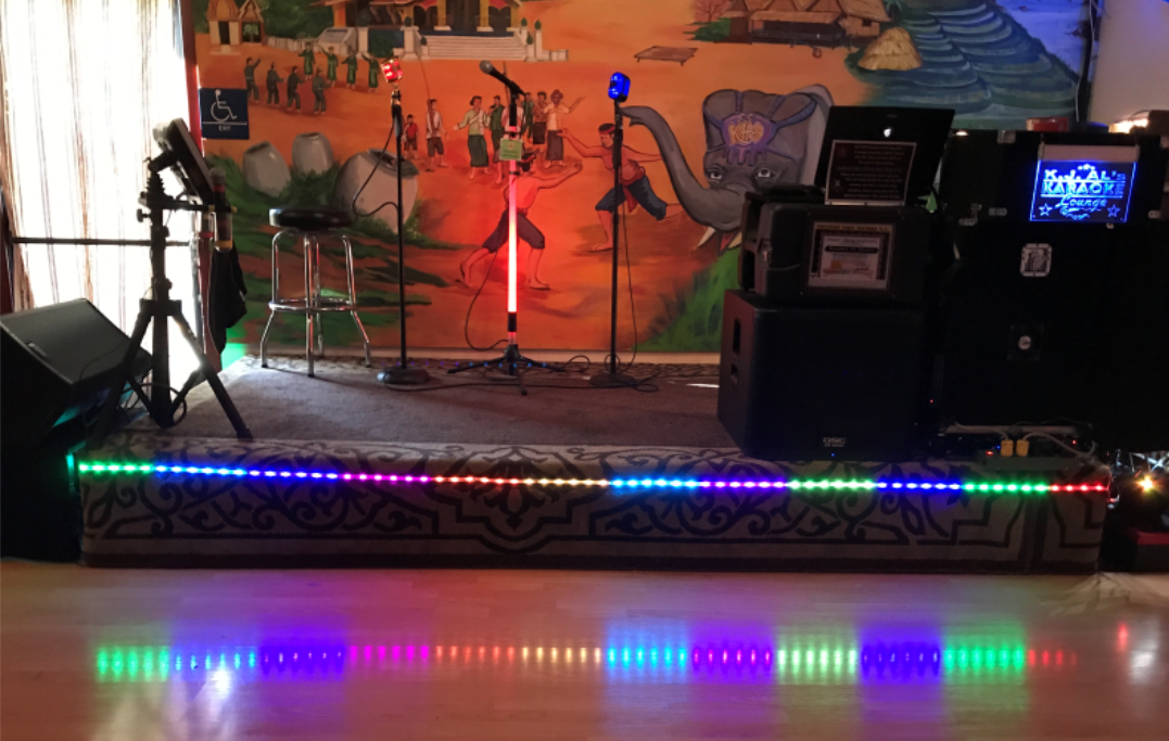 Stage Light. Easy installation, easy take down. Flexible LED tape light strip - 18ft linkable up to 36ft Multiple light functions, flash, jump, trail, race, run, etc. remote included Bright color lights are dimmable. Home Depot $60 http://www.homedepot.com/p/Commercial-E ... /206273002Attachment: